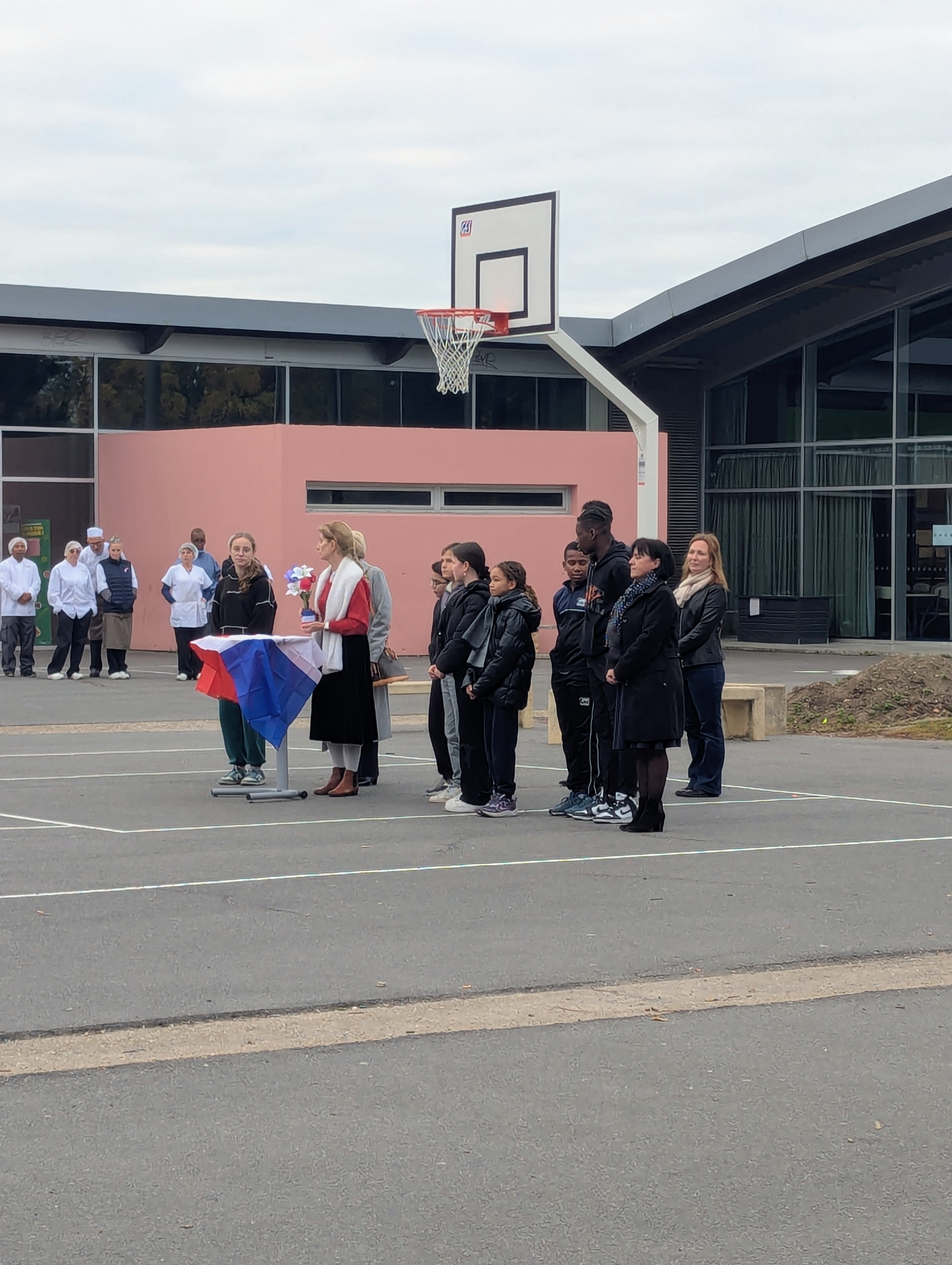 En présence de membres de la direction, de personnalités invitées et de représentants de parents d’élèves, la cérémonie a été ouverte par un discours de Madame Bouzidi, chef d’établissement, suivi de la lecture d’un texte par Mme Borrel. Une minute de silence a ensuite été observée en mémoire des deux enseignants.